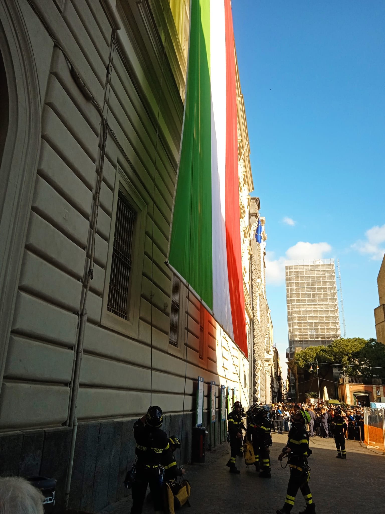Spettacolare scalata dei vigili del fuoco della facciata del Liceo Classico Genovesi, in piazza del Gesù a Napoli, per la festa di Santa Barbata, patrona del Corpo dei pompieri. La banda musicale in piazza ha suonato l'Inno di Mameli. Un enorme bandiera tricolore è stata stesa sulla facciata della scuola.