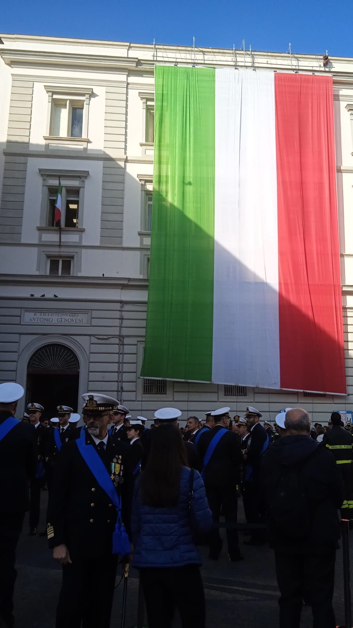 Spettacolare scalata dei vigili del fuoco della facciata del Liceo Classico Genovesi, in piazza del Gesù a Napoli, per la festa di Santa Barbata, patrona del Corpo dei pompieri. La banda musicale in piazza ha suonato l'Inno di Mameli. Un enorme bandiera tricolore è stata stesa sulla facciata della scuola.