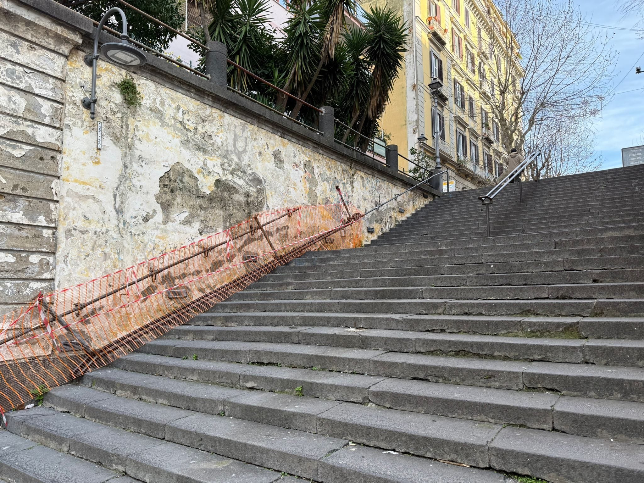 Divelto il corrimano di metallo delle scale di via Scarlatti al Vomero, che collegano piazza Vanvitelli a via Morghen. Il consigliere Rino Nasti (Verdi): "Corroso dall'acido urico e usato come scivolo dai ragazzi". Danneggiati e arrugginiti anche i passamano laterali, che sono stati transennati.
