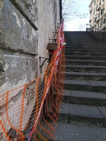Divelto il corrimano di metallo delle scale di via Scarlatti al Vomero, che collegano piazza Vanvitelli a via Morghen. Il consigliere Rino Nasti (Verdi): "Corroso dall'acido urico e usato come scivolo dai ragazzi". Danneggiati e arrugginiti anche i passamano laterali, che sono stati transennati.
