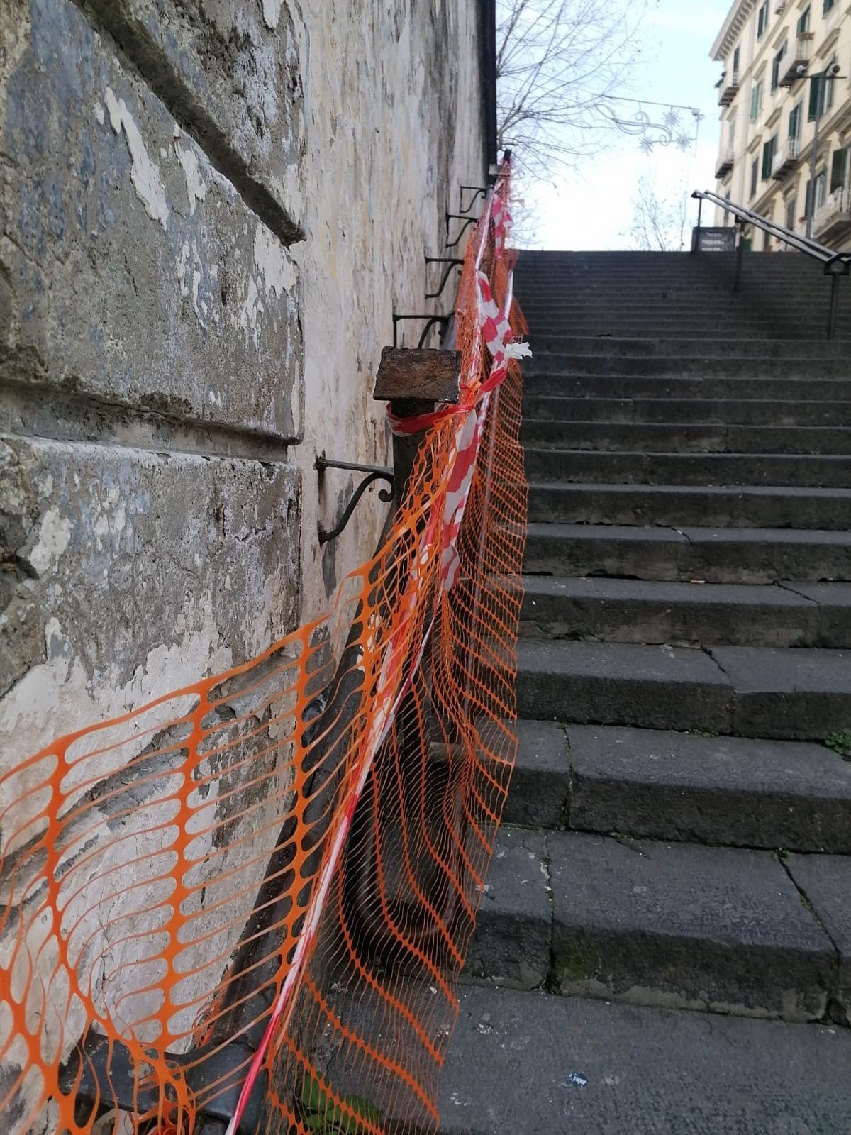 Divelto il corrimano di metallo delle scale di via Scarlatti al Vomero, che collegano piazza Vanvitelli a via Morghen. Il consigliere Rino Nasti (Verdi): "Corroso dall'acido urico e usato come scivolo dai ragazzi". Danneggiati e arrugginiti anche i passamano laterali, che sono stati transennati.