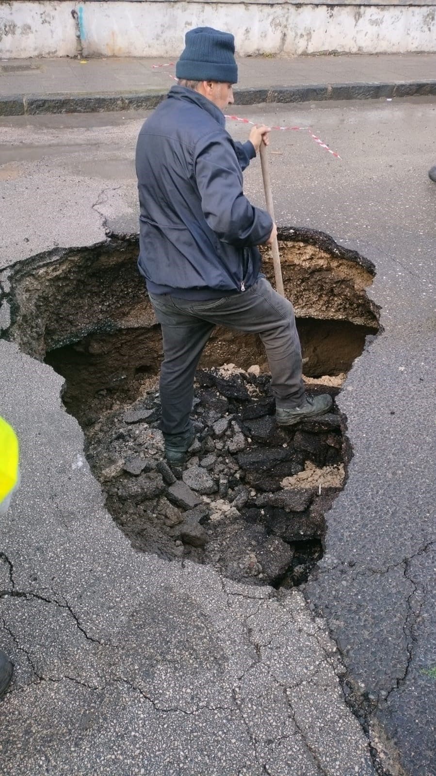 Sprofondata via Bagnoli, la strada dove in questi giorni passano i tir per i cantieri dell'America's Cup. Chiusa la strada. Sul posto i tecnici dell'Abc e la Polizia Locale.