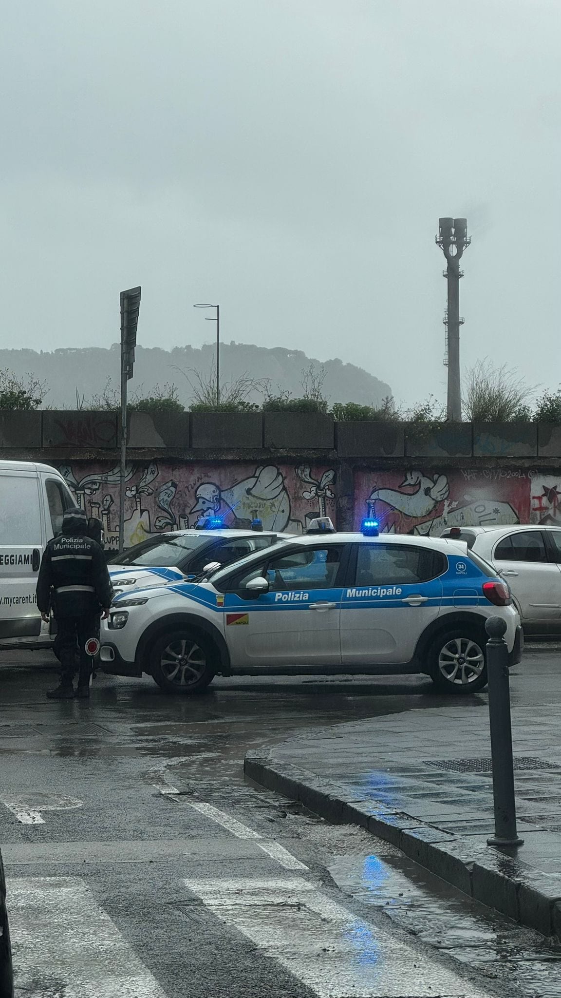 Sprofondata via Bagnoli, la strada dove in questi giorni passano i tir per i cantieri dell'America's Cup. Chiusa la strada. Sul posto i tecnici dell'Abc e la Polizia Locale.