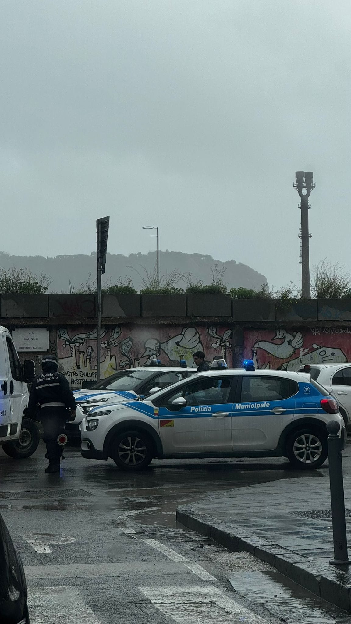 Sprofondata via Bagnoli, la strada dove in questi giorni passano i tir per i cantieri dell'America's Cup. Chiusa la strada. Sul posto i tecnici dell'Abc e la Polizia Locale.