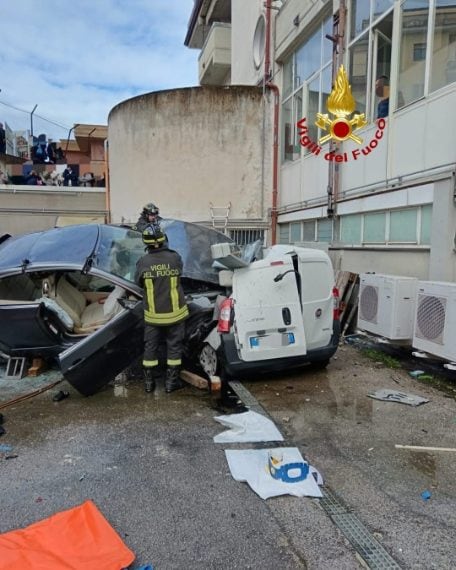 Incidente stradale ad Agropoli la mattina del 5 febbraio. Auto sfonda il parapetto e vola giù, atterrando su un furgone. Morto 83enne alla guida. Ferita la moglie. Sul posto vigili del fuoco di Salerno, 118 e forze dell'ordine.