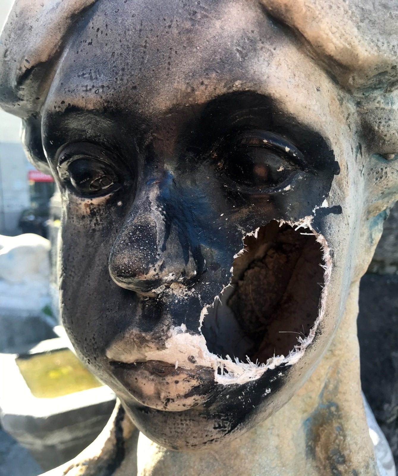 Vandalizzata la sfinge della fontana del Seguro di piazza Mercato: ha la testa sfondata. La denuncia di Antonio Alfano, presidente dell'associazione No Comment.