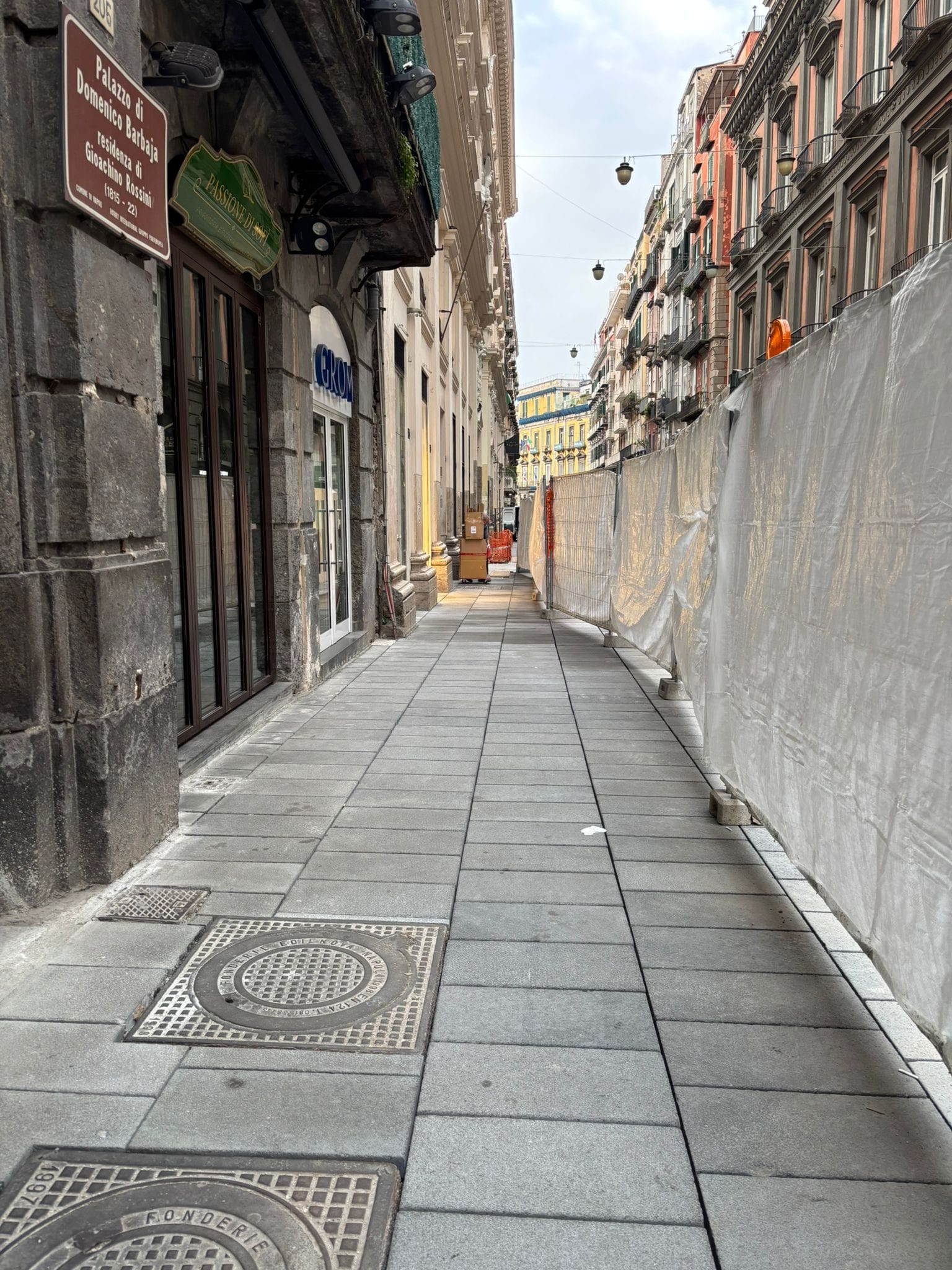 I marciapiedi di via Toledo sul lato della Galleria Umberto I sono stati quasi ultimati e restituiscono la vista di come sarà alla fine la nuova strada frequentata da migliaia di cittadini e turisti ogni giorno.