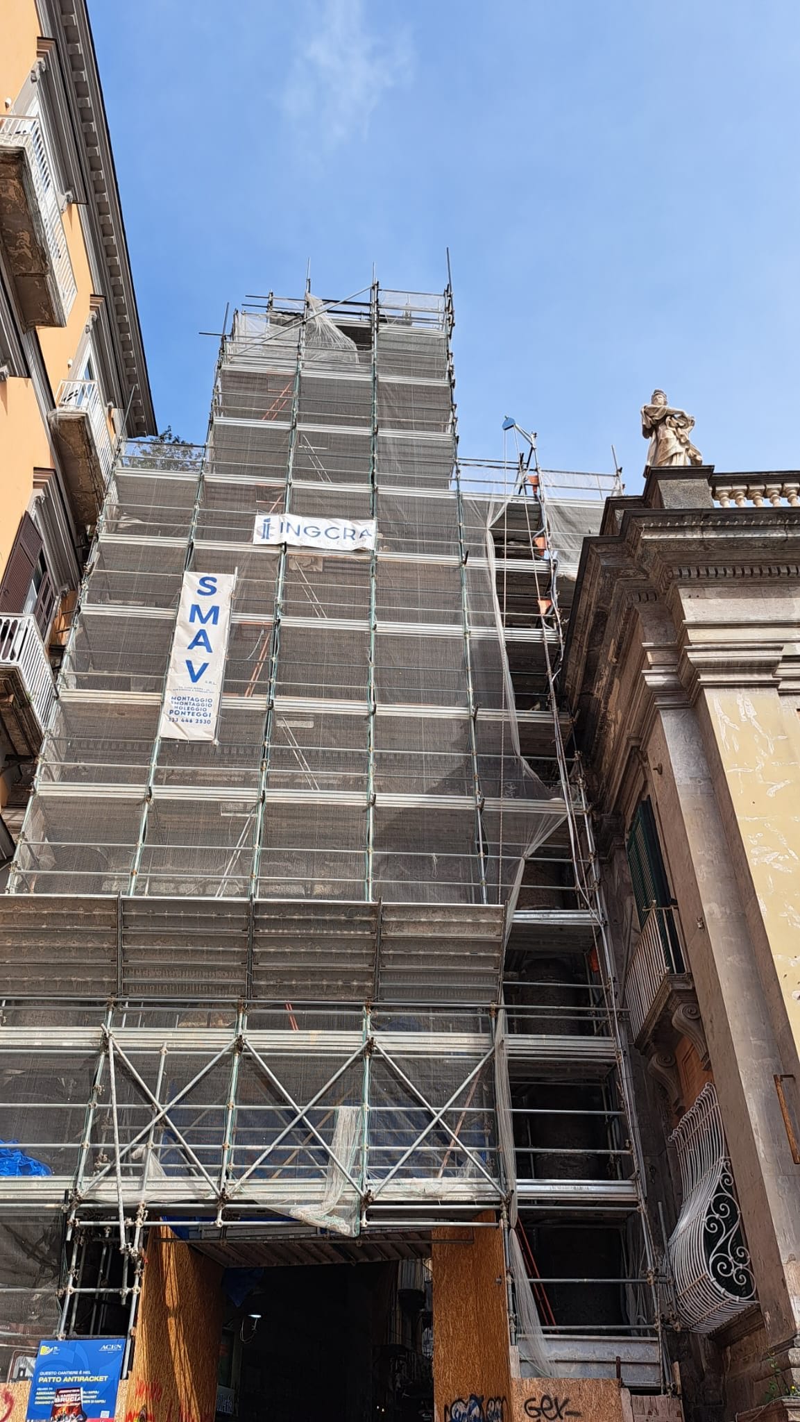 Port'Alba, la porta monumentale di Napoli, vicino a piazza Dante, è ancora ingabbiata dalle reti protettive a causa dei dissesti dopo i crolli di calcinacci del 2015. Nuovo progetto del Comune e della Soprintendenza per il restauro.