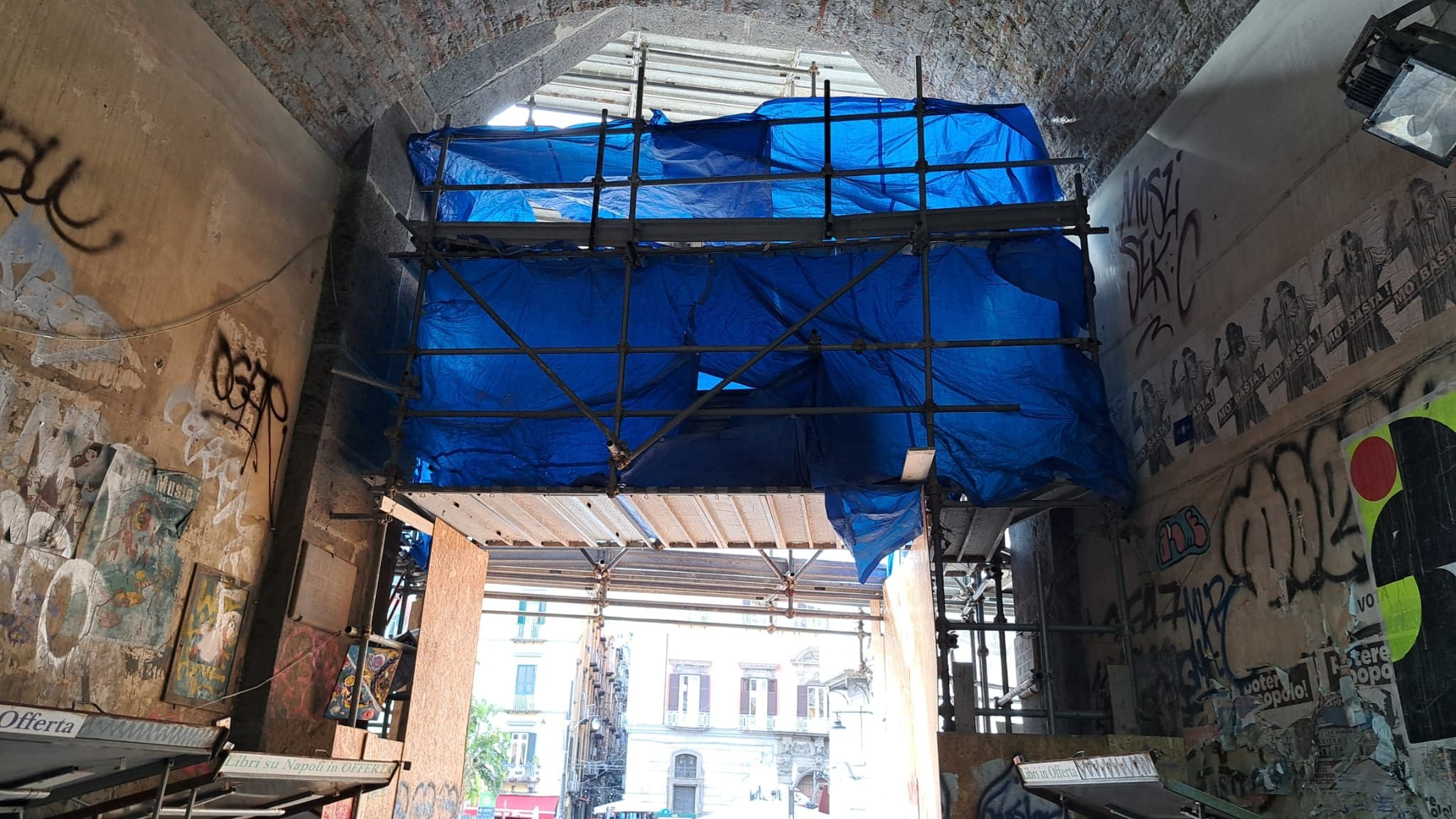 Port'Alba, la porta monumentale di Napoli, vicino a piazza Dante, è ancora ingabbiata dalle reti protettive a causa dei dissesti dopo i crolli di calcinacci del 2015. Nuovo progetto del Comune e della Soprintendenza per il restauro.