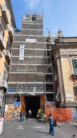 Port'Alba, la porta monumentale di Napoli, vicino a piazza Dante, è ancora ingabbiata dalle reti protettive a causa dei dissesti dopo i crolli di calcinacci del 2015. Nuovo progetto del Comune e della Soprintendenza per il restauro.