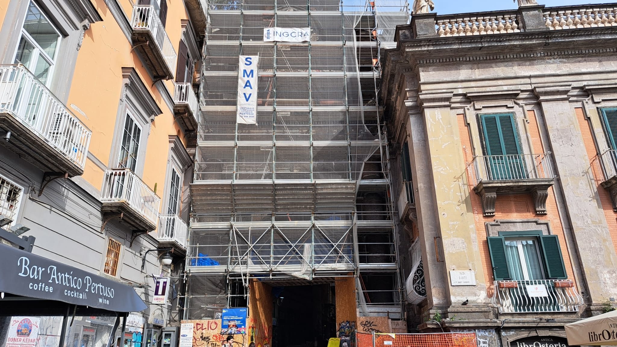 Port'Alba, la porta monumentale di Napoli, vicino a piazza Dante, è ancora ingabbiata dalle reti protettive a causa dei dissesti dopo i crolli di calcinacci del 2015. Nuovo progetto del Comune e della Soprintendenza per il restauro.