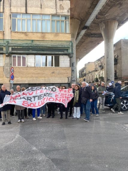 Protesta dei residenti che vivono nei pressi del viadotto della ex 162Dir. La zona compresa tra via Traccia, via Ferrante Imparato, via del Macello e via De Roberto. "Qui passaggio continuo di tir con container, strade dissestate e smog. Ora basta. Intervengano sindaco e prefetto".