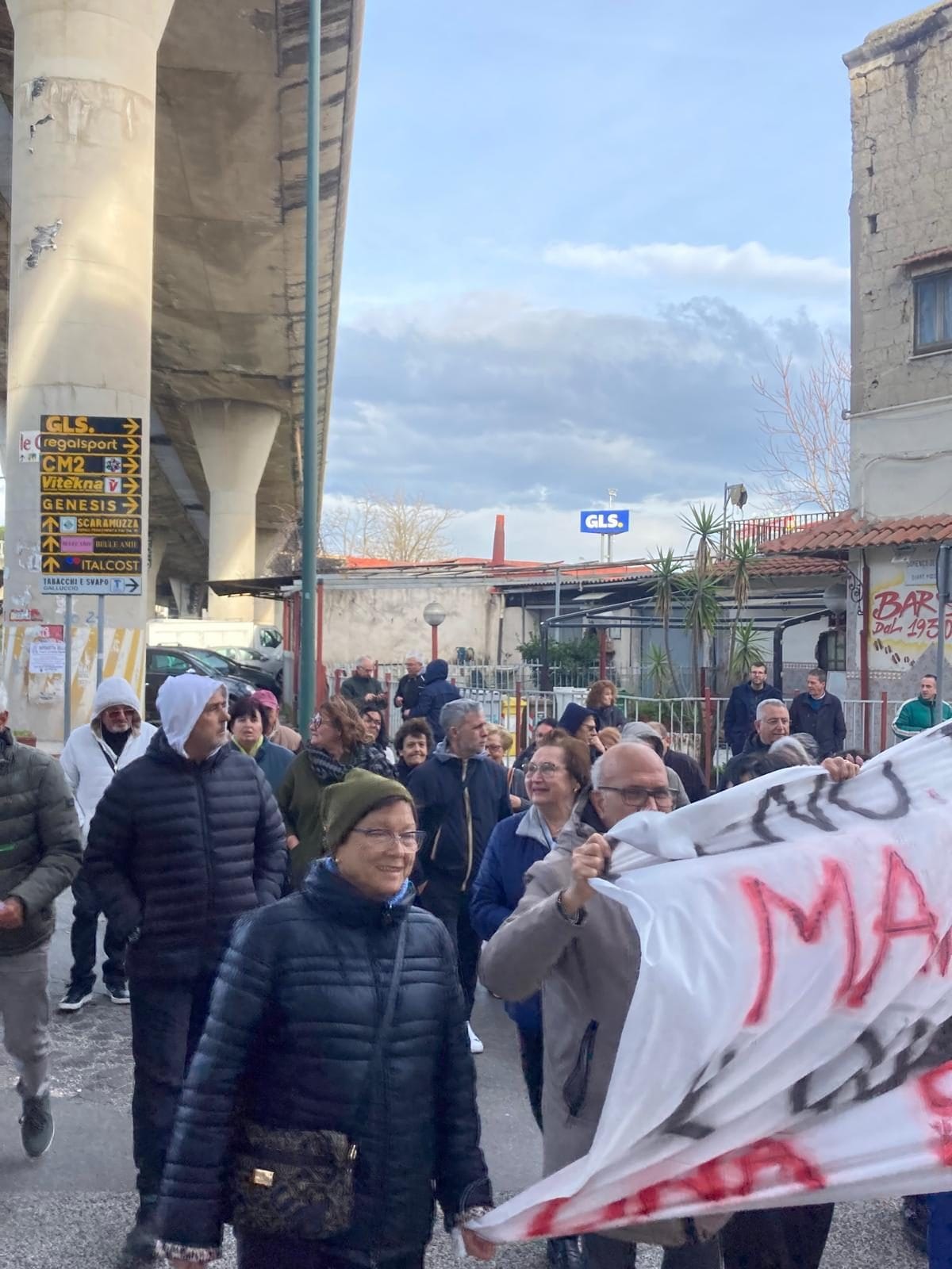Protesta dei residenti che vivono nei pressi del viadotto della ex 162Dir. La zona compresa tra via Traccia, via Ferrante Imparato, via del Macello e via De Roberto. "Qui passaggio continuo di tir con container, strade dissestate e smog. Ora basta. Intervengano sindaco e prefetto".