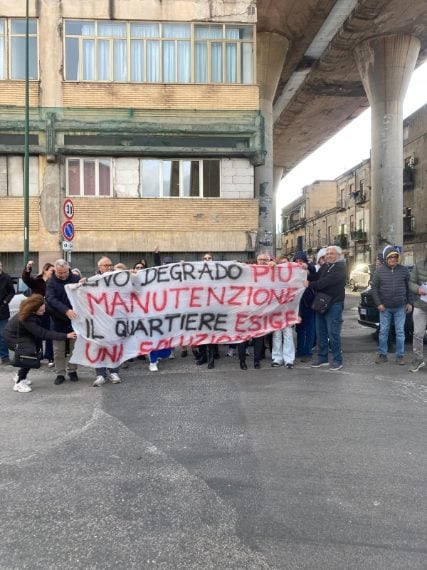 Protesta dei residenti che vivono nei pressi del viadotto della ex 162Dir. La zona compresa tra via Traccia, via Ferrante Imparato, via del Macello e via De Roberto. "Qui passaggio continuo di tir con container, strade dissestate e smog. Ora basta. Intervengano sindaco e prefetto".