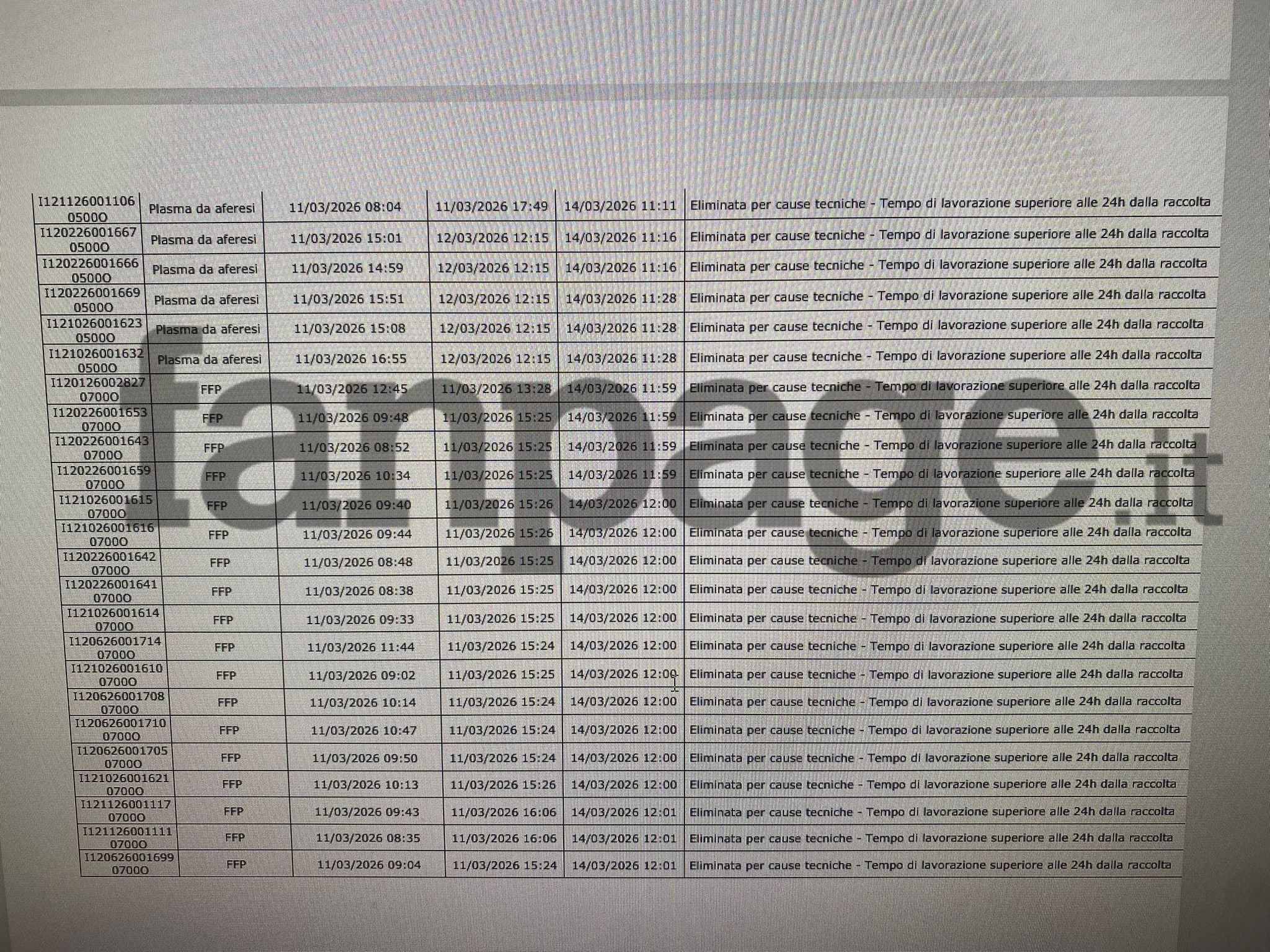 Parte delle centinaia di sacche di plasma già eliminate al 18 marzo. Lo smaltimento è proseguito poi nei giorni successivi. In ogni caso, le ragioni sono sempre i "tempi di lavorazione superiori alle 24 ore dalla raccolta".