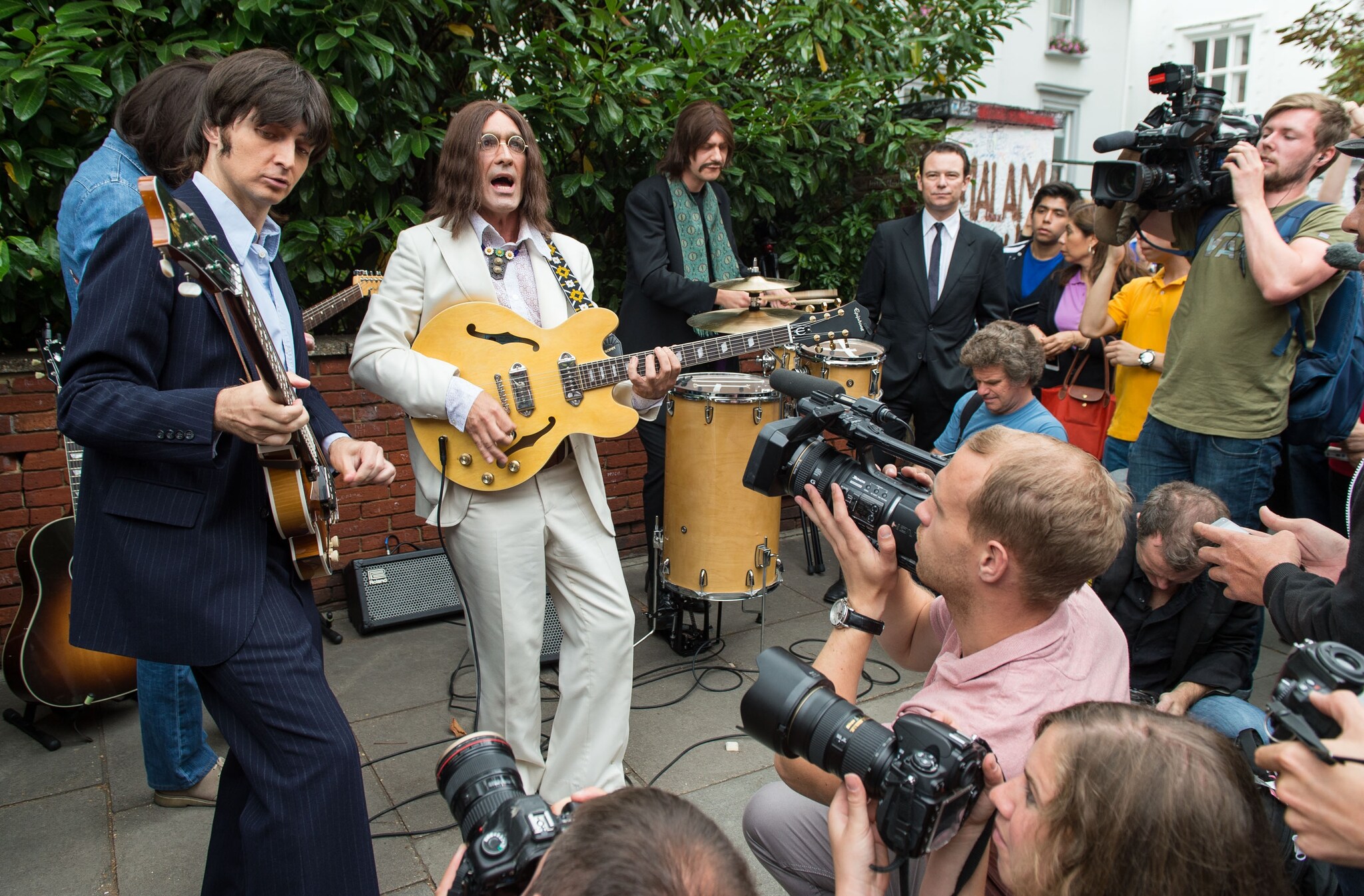 L'8 agosto del 1969, i Beatles venivano immortalati sulle strisce pedonali in Abbey Road. Oggi, 45 anni dopo, gli artisti del musical "Let it be" hanno improvvisato un concerto nello stesso luogo.