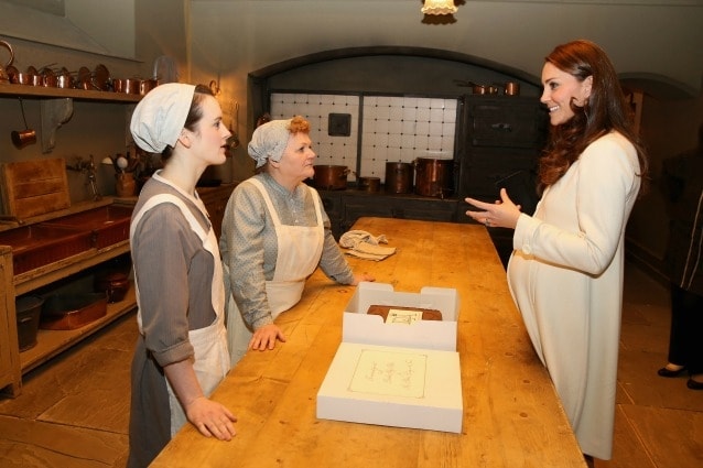 La duchessa di Cambridge si è recata in visita sul set della popolare serie tv britannica in costume. Ormai vicina al parto, la moglie del principe William ha incontrato i membri del cast e della troupe.