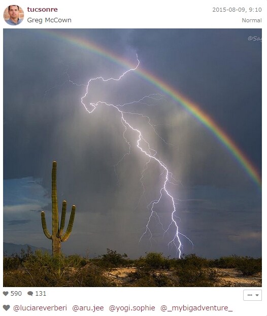 Immortalare nella stessa foto un fulmine e un arcobaleno, una cosa mai vista prima. A riuscirci è Greg McCown, agente immobiliare con una grande passione per la fotografia. In Arizona, grazie all'ausilio del lightning trigger, un apparecchio che rileva i fulmini e fa scattare in automatico la macchina fotografica, è riuscito nell'impresa che inseguiva da anni.