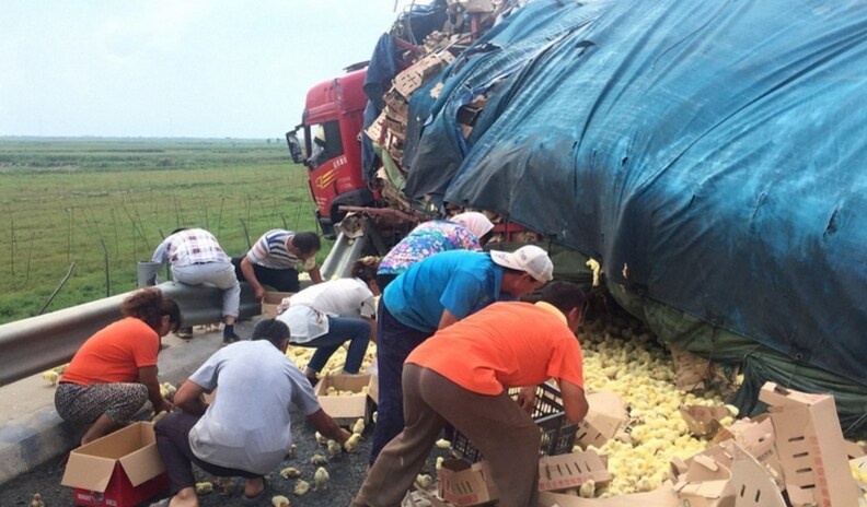 Un tir con un carico di oltre 10mila pulcini, per un valore di circa 7mila euro, si è ribaltato su una trafficata autostrada cinese. La Polizia si è trovata impreparata e non è riuscita a bloccare le orde di passanti che, armati di scatoloni, portavano via la pennuta refurtiva.