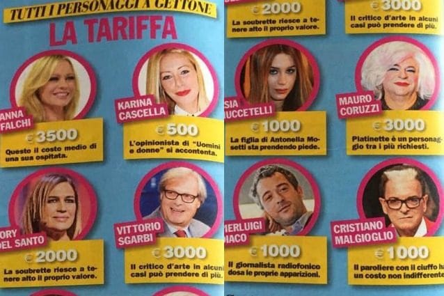 Il settimanale Spy rende noti i presunti gettoni di presenza richiesti dai più noti opinionisti tv del momento per una comparsata della durata di alcune ore al massimo.