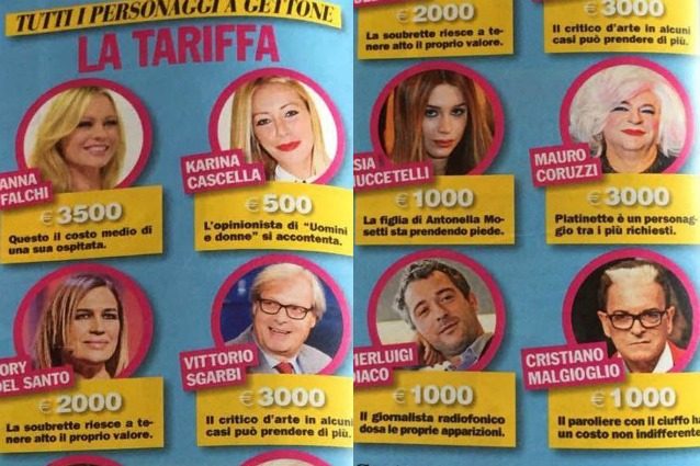Il settimanale Spy rende noti i presunti gettoni di presenza richiesti dai più noti opinionisti tv del momento per una comparsata della durata di alcune ore al massimo.