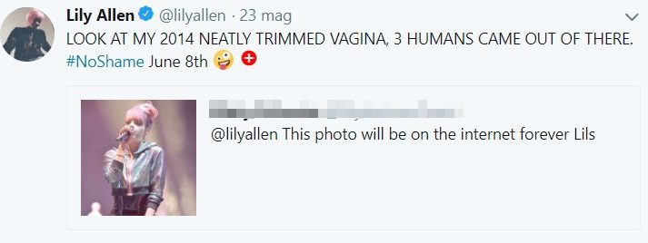 Era il 2014  Lily Allen si esibì sul palco del Hurricane Festival in Germania, a gambe aperte e senza slip, con... parti intime in vista. Quell'immagine è tornata a circolare su Twitter, condivisa da un fan, ma la cantante non ha fatto una piega. Anzi, ha ritwittato scherzando con l'hashtag #Noshame ("senza vergogna"): "Guardate la mia vagina depilata, tre esseri umani sono venuti fuori da qui".  Guarda caso, "No Shame" è il titolo del disco che esce l'8 giugno.