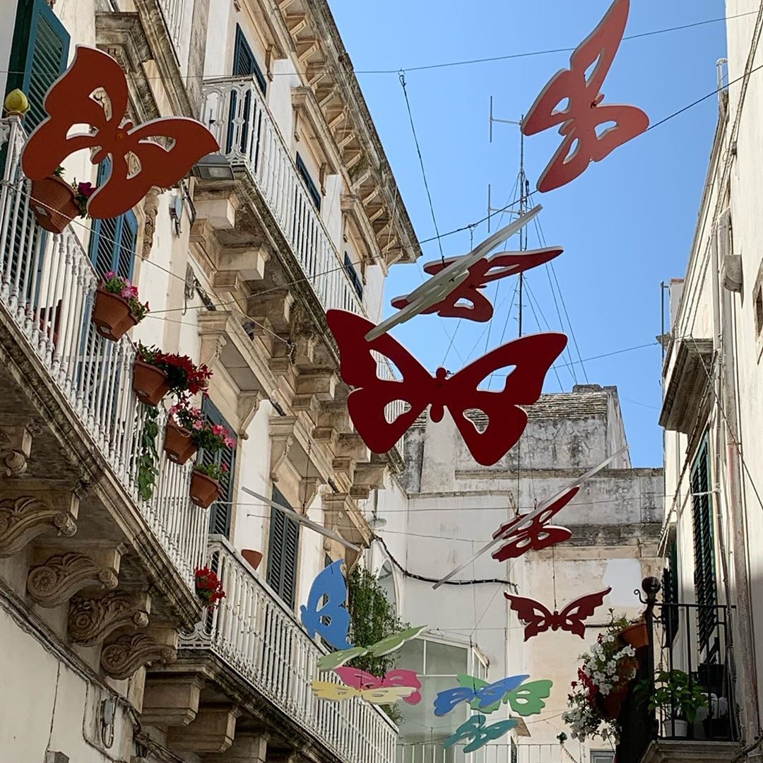 320 farfalle colorate, sostenute da fili per le strade della città di Martina Franca nella zona del centro storico. Un modo per raccogliere un numero più alto di foto pubblicate sui social così da avere un riscontro e un ritorno in termini di visibilità.