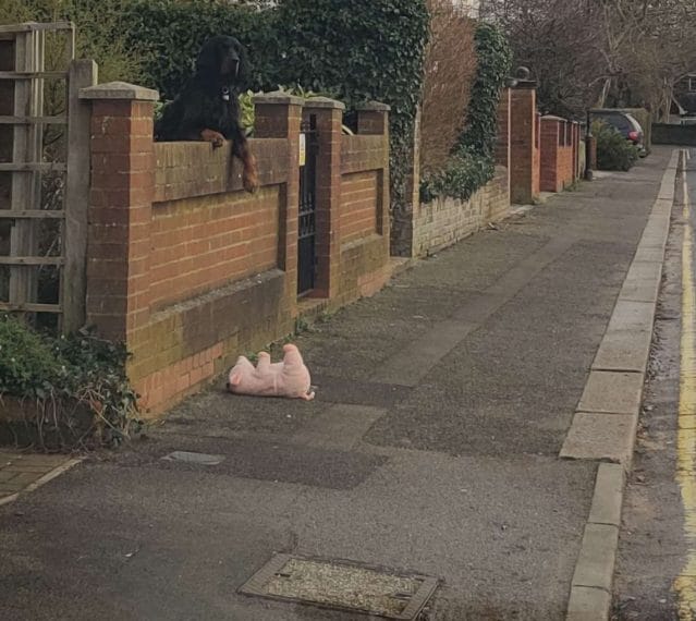 Una donna di nome Claire, di Basingstoke nel sud del'Inghilterra, ha pubblicato queste foto in cui ha spiegato la storia. Stava camminando in auto quando ha notato un peluche sul marciapiede: all'inizio non ha capito cosa fosse ma poi si è resa conto che apparteneva a quel cane che disperatamente provava a recuperarlo. Così si è fermata per ridare il maialino al legittimo proprietario.