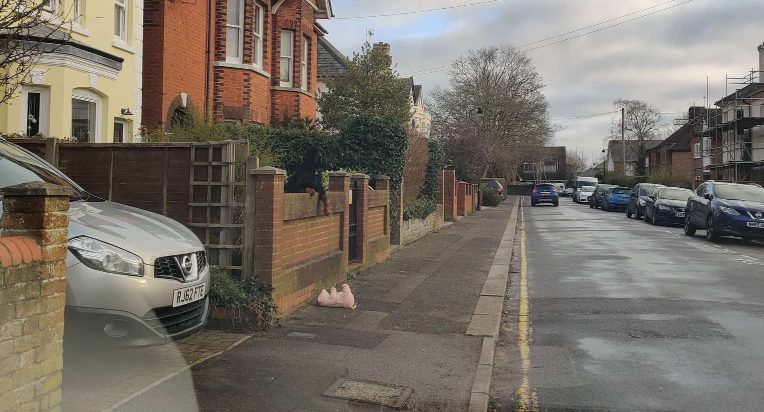 Una donna di nome Claire, di Basingstoke nel sud del'Inghilterra, ha pubblicato queste foto in cui ha spiegato la storia. Stava camminando in auto quando ha notato un peluche sul marciapiede: all'inizio non ha capito cosa fosse ma poi si è resa conto che apparteneva a quel cane che disperatamente provava a recuperarlo. Così si è fermata per ridare il maialino al legittimo proprietario.