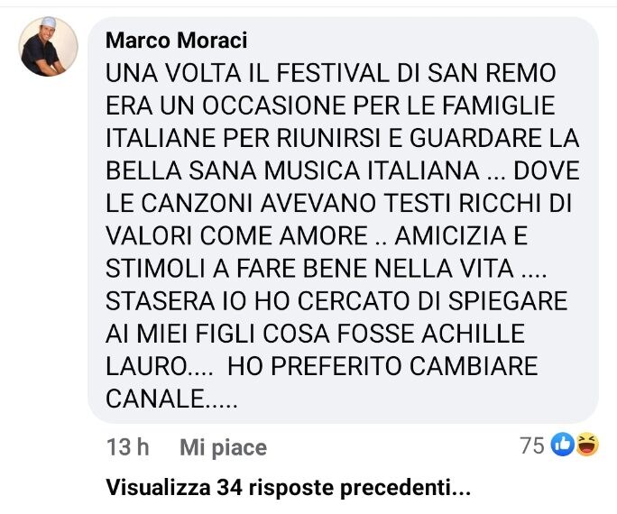 "Più che un Festival di Sanremo, è un Gay Pride". Così Marco Moraci, chirurgo plastico e marito di Veronica Maya, ha commentato sul suo profilo Facebook il Festival di Sanremo. Il post ha scatenato molte polemiche.