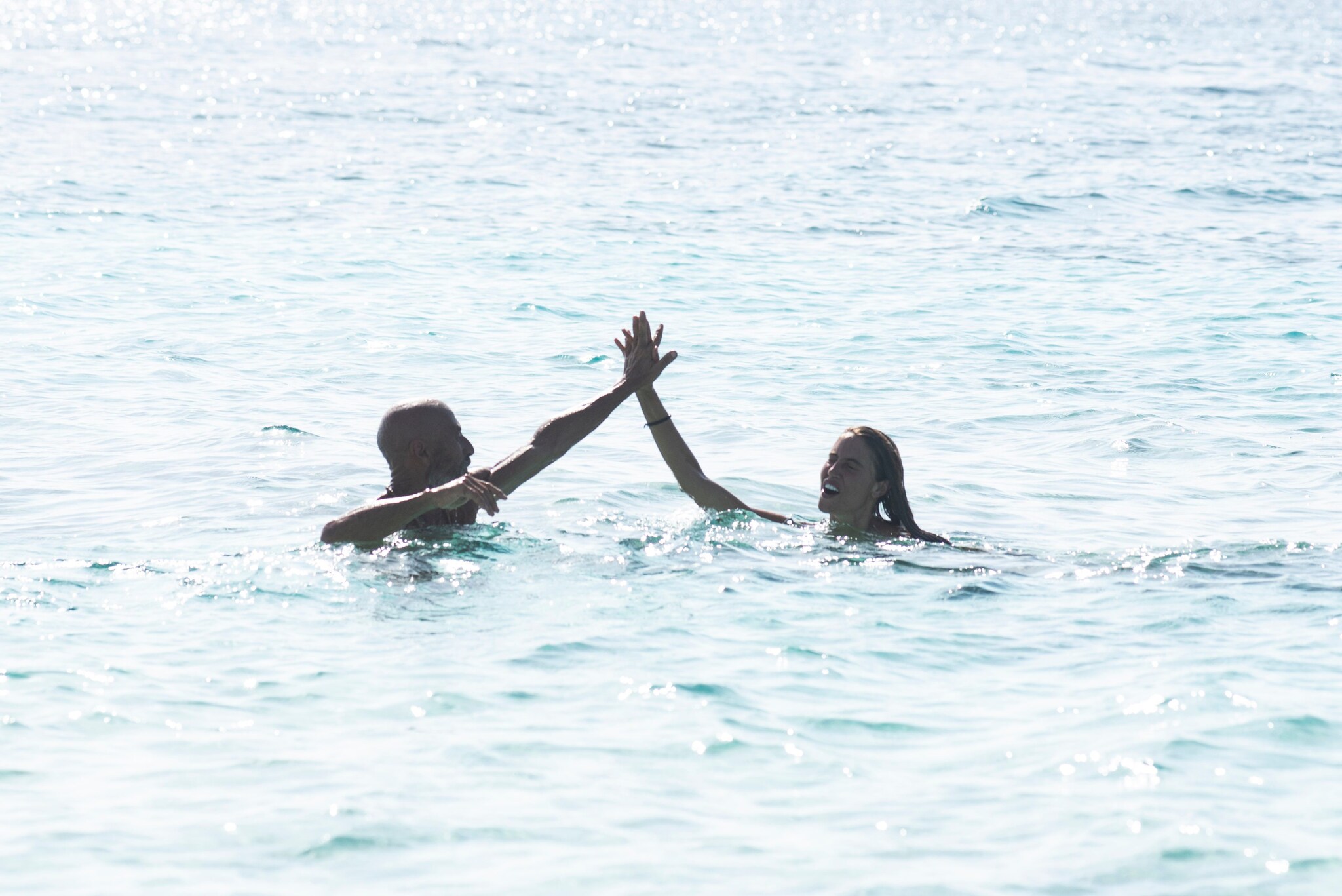 All'Isola dei Famosi, Cayo Paloma si trasforma per un momento in Playa Dasnuda, con il comico e la modella che si regalano un liberatorio bagno senza vestiti nelle acque del Mar dei Caraibi.