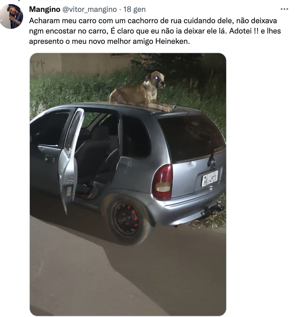 Il messaggio pubblicato su Twitter "Hanno trovato la mia macchina con un cane randagio che se ne prendeva cura, non permetteva a nessuno di toccare la macchina, certo che non avevo intenzione di lasciarlo lì. L'ho adottato!! Vi presento il mio nuovo migliore amico Heineken". L'incredibile storia arriva dal Brasile e Vitor, il protagonista, la racconta spiegando che poco prima aveva messo da parte i suoi guadagni per acquistare un'automobile. Dopo poco però la sua vettura venne rubata e Vitor, pur avendo avvertito la polizia, non aveva molte speranze di ritrovarla. Il giorno successivo la chiamata inaspettata degli agenti, l'auto era stata ritrovata. Svuotata di alcuni averi, ma sostanzialmente intatta. Arrivato sul posto aveva visto una cane sul tetto dell'auto, che sembrava a guardia della vettura. Un episodio che ha toccato il giovane che ha deciso di adottare quel randagio e donargli una casa e tanto amore.