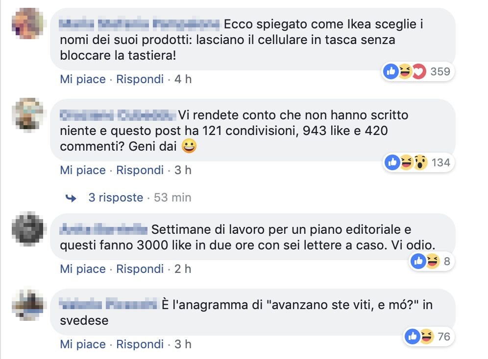 "hhsdjh", è questo lo strano testo comparso da qualche ora sulla pagina ufficiale di Ikea: che si tratti di un errore o di una strana strategia pensata dall'azienda per fomentare commenti e condivisioni rimane un mistero. Ma, in poche ore, il post è diventato il contenuto più commentato e condiviso sulla pagina di Ikea.