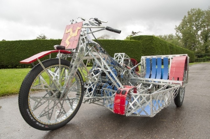 Avreste mai pensato di vedere una moto fatta tutta di Meccano? Eccola. Creata nel programma James May's Toy Stories prodotto da BBC, la motocicletta è fatta di vero e proprio Meccano. La sfida del prorama era quella di produrre una moto in grado di completare il circuito 37.8 miglia Isle Of Man TT nell'arco di tre giorni.