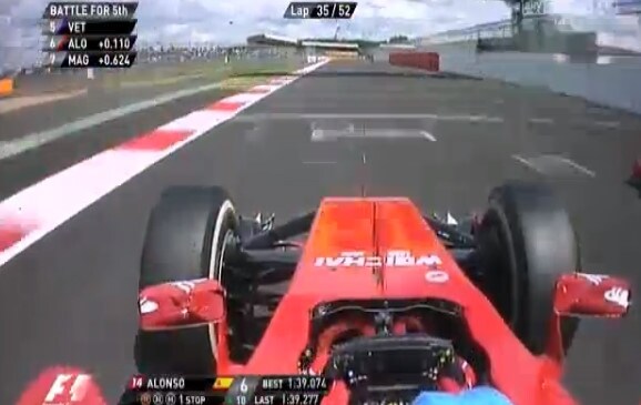 Fernando Alonso continua la sua rimonta anche dopo la penalità. Guardate con che "fame" supera Sebastian Vettel e guadagna la quinta posizione.