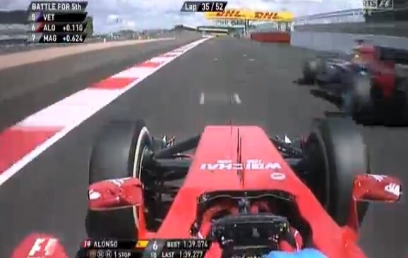 Fernando Alonso continua la sua rimonta anche dopo la penalità. Guardate con che "fame" supera Sebastian Vettel e guadagna la quinta posizione.