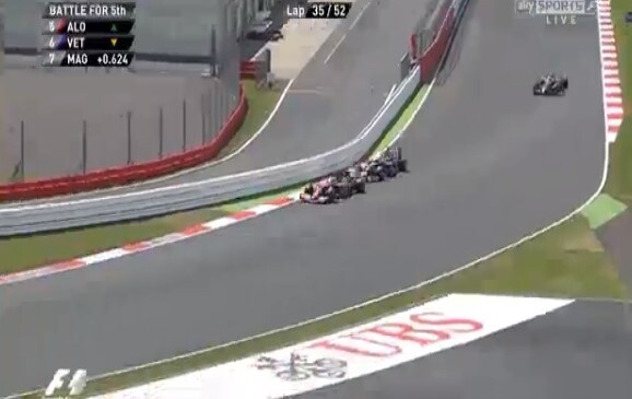 Fernando Alonso continua la sua rimonta anche dopo la penalità. Guardate con che "fame" supera Sebastian Vettel e guadagna la quinta posizione.