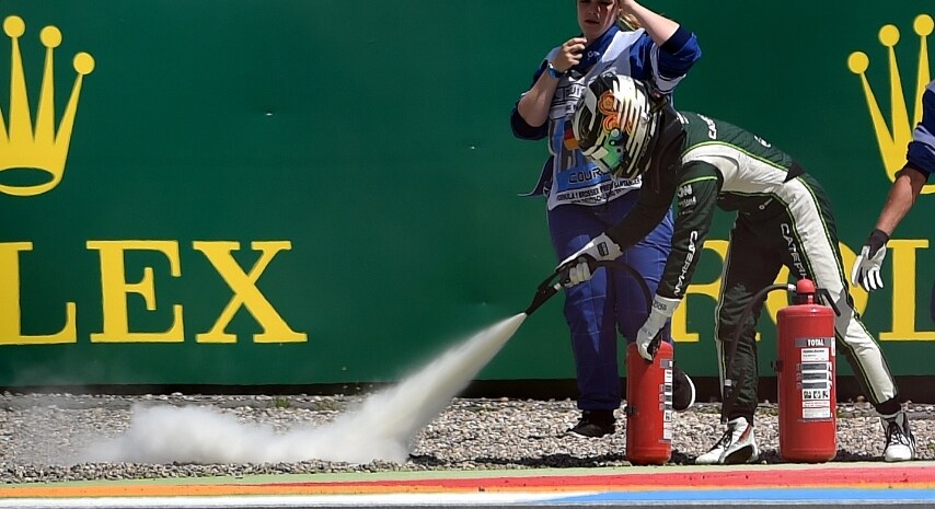 Motore in fumo per il pilota della Caterham durante il secondo turno di libere del GP di Germania. Il giapponese è riuscito a saltare fuori dalla sua monoposto prima che venisse avvolta dalle fiamme.