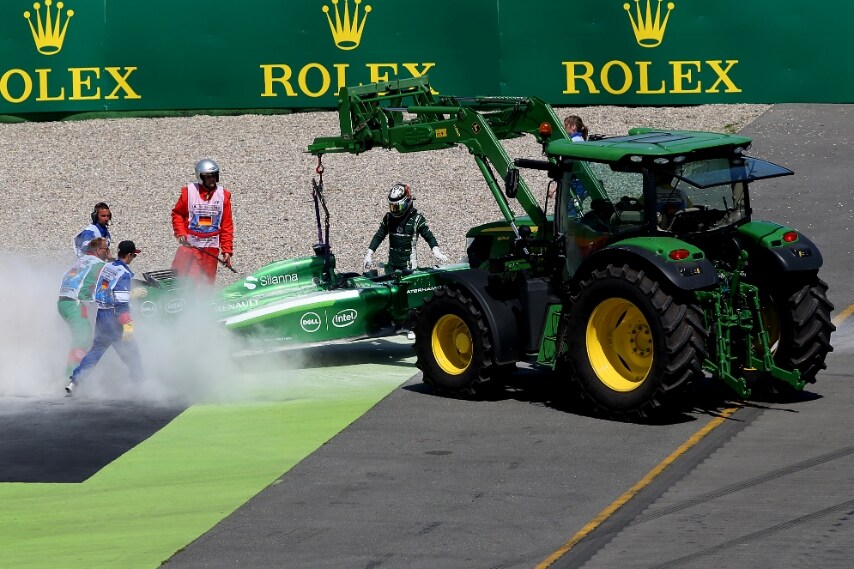 Motore in fumo per il pilota della Caterham durante il secondo turno di libere del GP di Germania. Il giapponese è riuscito a saltare fuori dalla sua monoposto prima che venisse avvolta dalle fiamme.