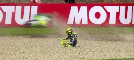 Il pluricampione pesarese perde l'anteriore della sua Yamaha il durante il quarto turno di libere del GP della Repubblica ceca. Il Dottore scivola e viene sfiorato dalla moto di Alvaro Bautista caduto subito dopo. Il pesarese non nasconde il suo disappunto e guardando con insistenza la mano sinistra si reca in clinica mobile dove i medici riscontrano un'abrasione al quinto dito della mano sinistra. Nessun contatto tra i piloti in pista.