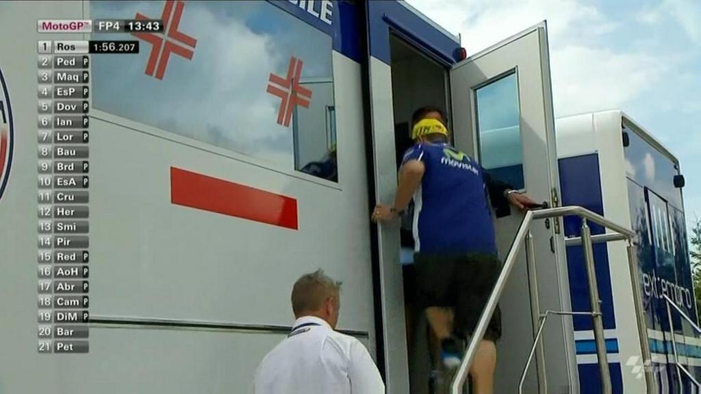 Il pluricampione pesarese perde l'anteriore della sua Yamaha il durante il quarto turno di libere del GP della Repubblica ceca. Il Dottore scivola e viene sfiorato dalla moto di Alvaro Bautista caduto subito dopo. Il pesarese non nasconde il suo disappunto e guardando con insistenza la mano sinistra si reca in clinica mobile dove i medici riscontrano un'abrasione al quinto dito della mano sinistra. Nessun contatto tra i piloti in pista.