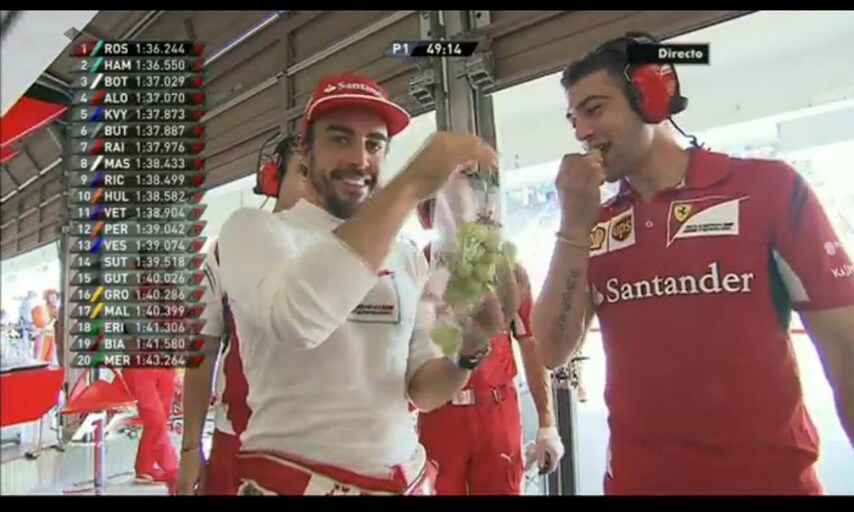 Tra uno stint e l’altro, durante il primo turno di libere del GP del Giappone, Fernando Alonso trova il tempo per un toccasana di salute e tira fuori un grappolo di uva da offrire agli ingegneri della Ferrari: come insegna la tradizione, chi soffre di disturbi digestivi dovrebbe consumare i preziosi acini che, con le loro proprietà benefiche, sono in grado di favorire l’assimilazione anche in caso di digestione lenta e difficile di Cavallini Rampanti.