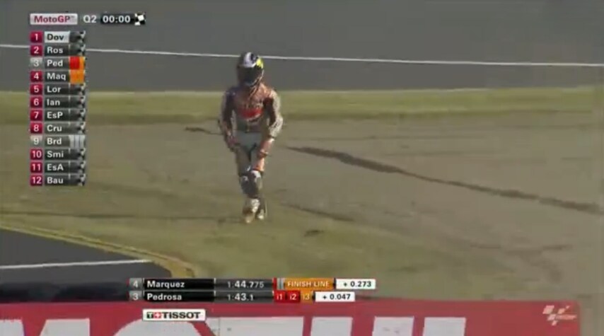 Nessuna conseguenza fisica ma solo qualche graffio da mostrare al parco chiuso. Dani Pedrosa, caduto nelle fasi finali del turno di qualifica del GP del Giappone dopo aver perso l’anteriore della sua Honda RCV213 nell’ultimo assalto al tempo, nonostante la scivolata centra un’importante terza casella in griglia di partenza. “Purtroppo sono scivolato alla penultima curva, ma sto bene.” ha spiegato lo spagnolo che in vista della gara di domani ha aggiunto: “Spero di fare una buona partenza. Sarà una corsa interessante, molti piloti sono andati molto forte, da Dovizioso a Lorenzo, vedremo cosa succederà”.