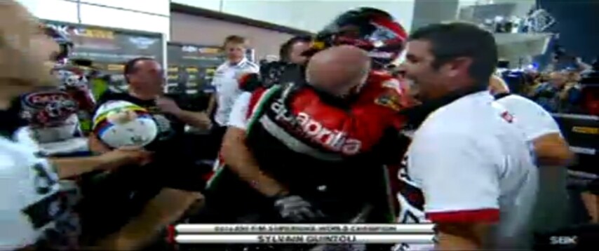 Lacrime sotto la visiera di Sylvain Guintoli che sella all’Aprilia RSV4 festeggia il suo primo titolo nel mondiale delle derivate di serie. Con la doppietta di Losail, Qatar, il francese beffa di 2 punti Tom Sykes e riporta a Noale un alloro iridato che mancava dal 2012, quando a cogliere il campionato delle derivate di serie era Max Biaggi. il primo pensiero di Sylvain è per la famiglia, per la bellissima moglie Caroline e i suoi bambini che abbraccia al parco chiuso.