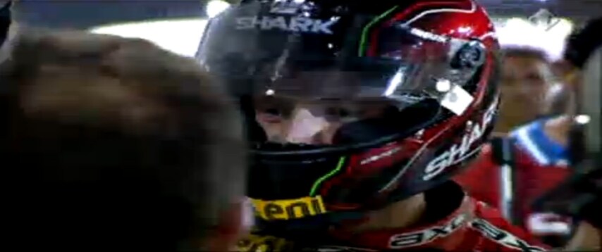 Lacrime sotto la visiera di Sylvain Guintoli che sella all’Aprilia RSV4 festeggia il suo primo titolo nel mondiale delle derivate di serie. Con la doppietta di Losail, Qatar, il francese beffa di 2 punti Tom Sykes e riporta a Noale un alloro iridato che mancava dal 2012, quando a cogliere il campionato delle derivate di serie era Max Biaggi. il primo pensiero di Sylvain è per la famiglia, per la bellissima moglie Caroline e i suoi bambini che abbraccia al parco chiuso.