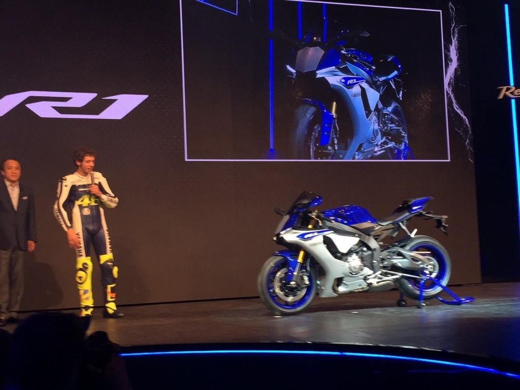 Il pluricampione pesarese presenta la nuova Yamaha R1, la supersportiva della Casa dei tre diapason: motore quadricilindrico da 200cv con airbox non in pressione per soli 199 kg di peso in assetto di marcia. Con Valentino Rossi anche Jorge Lorenzo che presenta la versione da gara R1M.