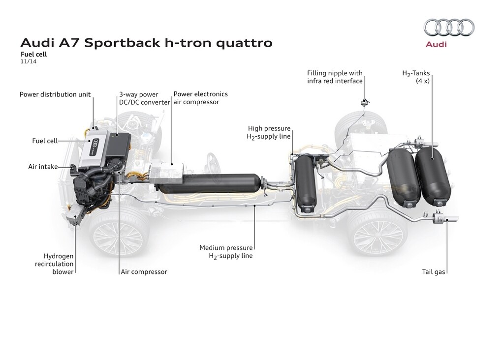 Audi lancia la sfida a Toyota presentando la sua prima vettura ad idrogeno. La A7 Sportback h-tron è un prototipo marciante spinto da due motori elettrici.