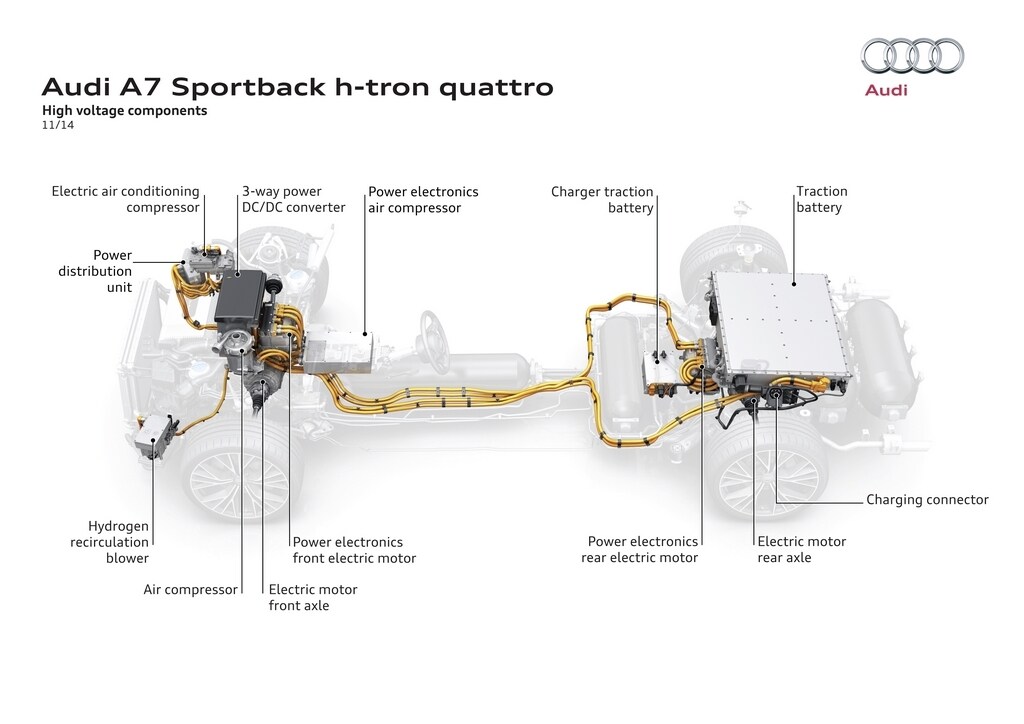 Audi lancia la sfida a Toyota presentando la sua prima vettura ad idrogeno. La A7 Sportback h-tron è un prototipo marciante spinto da due motori elettrici.