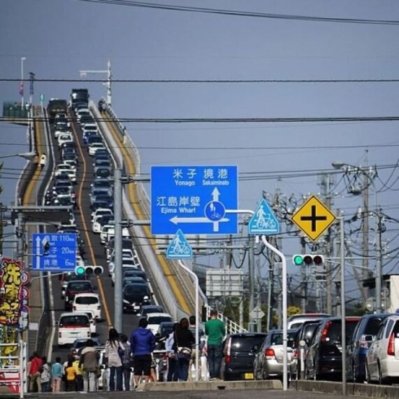 Un'altezza di 11,4 metri. Questa è una delle specificità dell'Eshima Ohashi, ponte che collega le città di Matsue e Sakaiminato. Questa costruzione si presenta con una pendenza a dir poco straordinaria perchè al di sotto passano le imbarcazioni che navigano il lago Nakaumi. Come fare un giro sulle montagne russe.