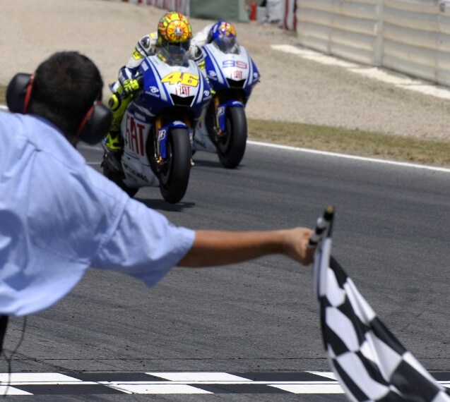 Il pesarese infila Jorge Lorenzo all'ultima curva del circuito del Montmelò dopo due giri al cardiopalma. Casey Stoner completa il podio.